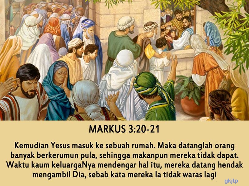 Meskipun keluarga Yesus dan orang-orang di sekitarNYA gelisah, dikatakan pada ayat yg ke-21 Waktu kaum keluarga-Nya mendengar hal itu, mereka datang hendak mengambil Dia, sebab kata mereka Ia tidak waras lagi.